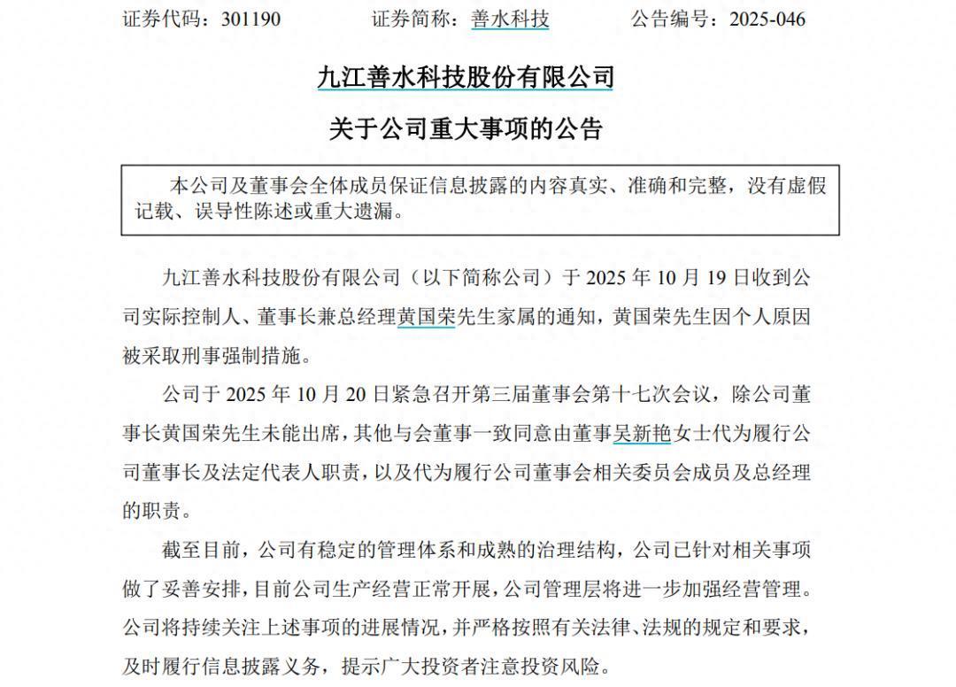 善水科技表示,公司于10月20日紧急召开第三届董事会第十七次会议,除公司董事长黄国荣未能出席,其他与会董事一致同意由董事吴新艳代为履行公司董事长及法定代表人职责,以及代为履行公司董事会相关委员会成员及总经理的职责。