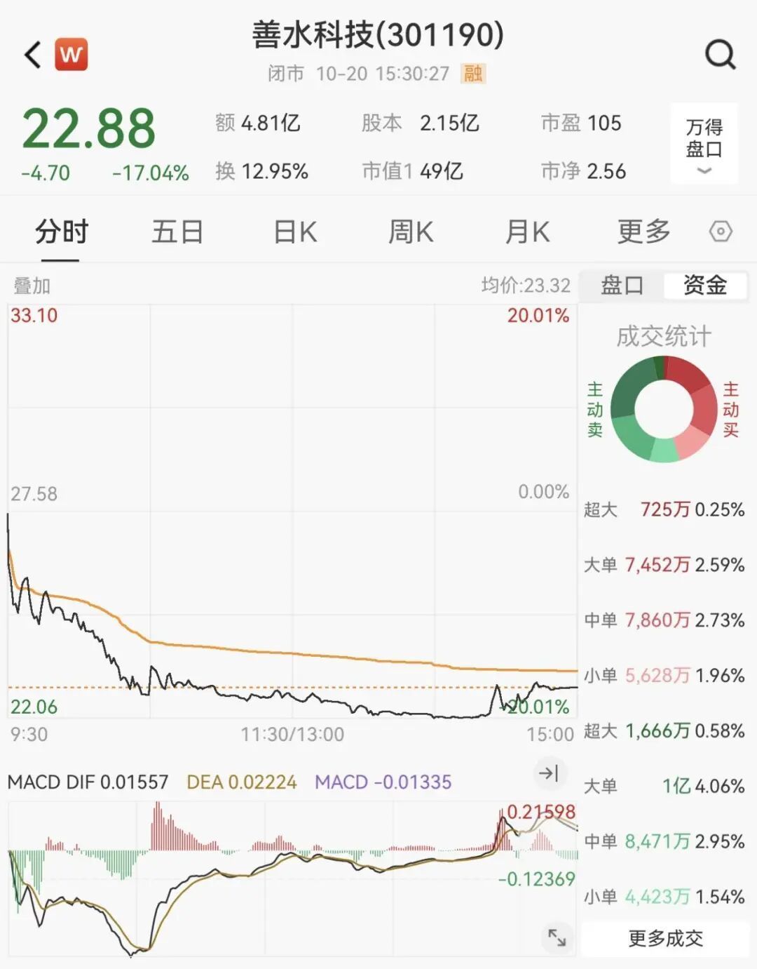 10月20日,善水科技股价大幅走低,一度触及跌停。截至收盘,该股报22.88元/股,总市值为49亿元。