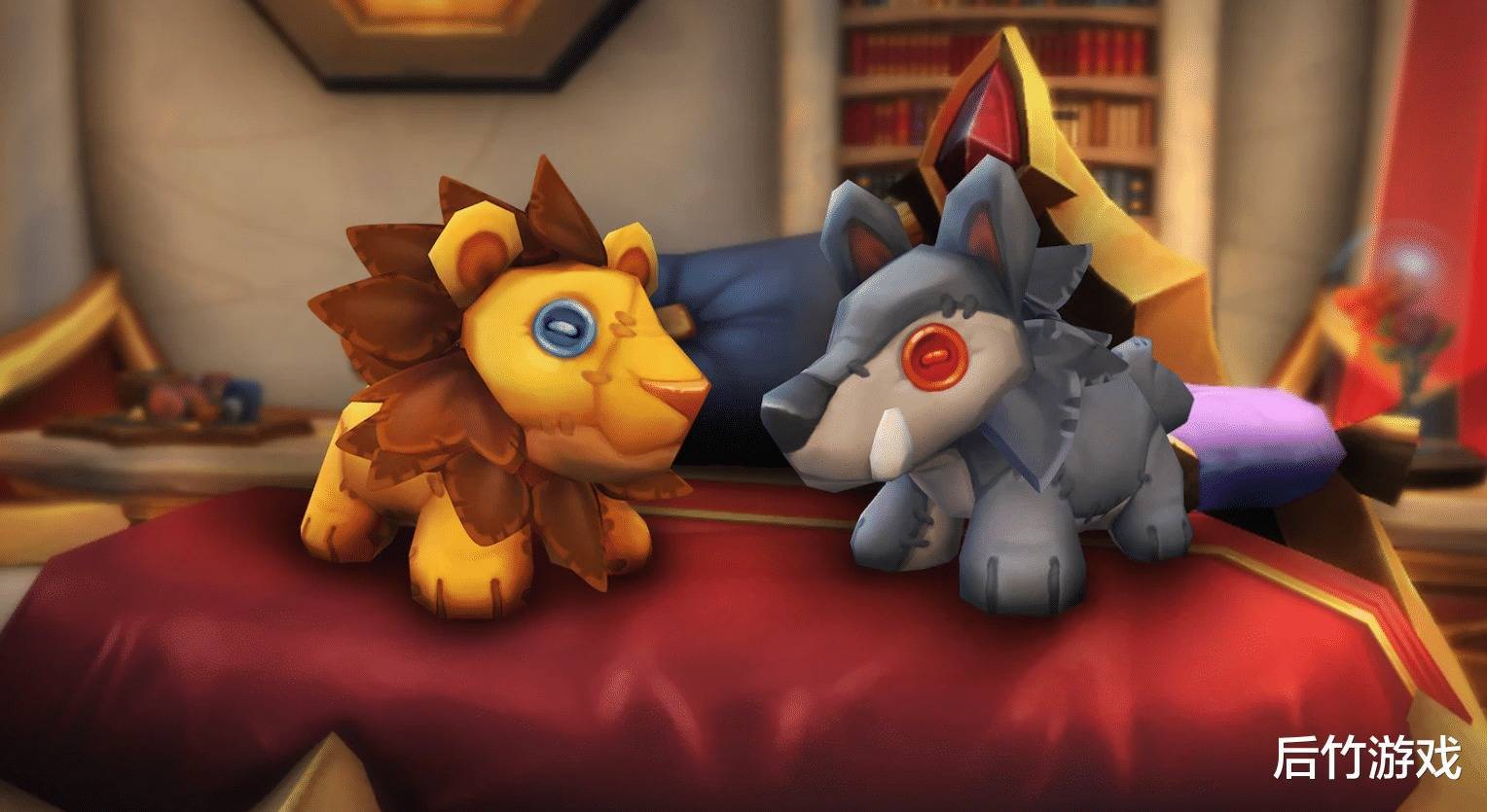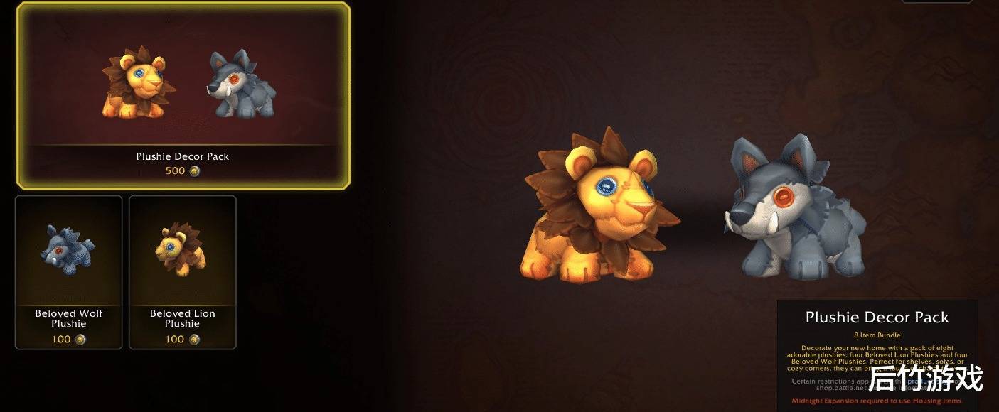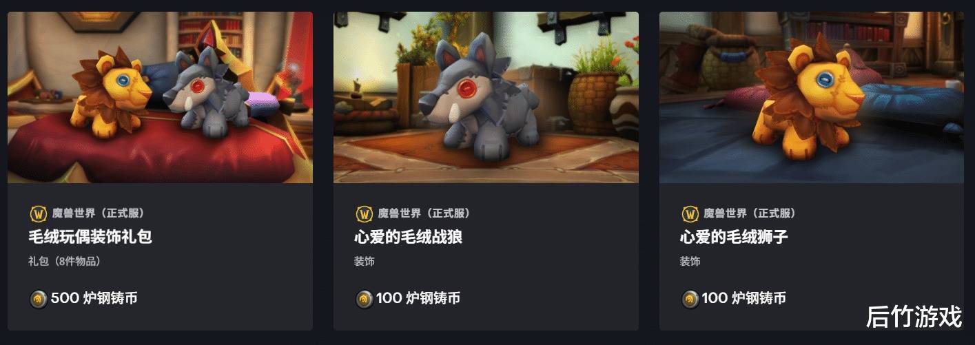 “心爱的毛绒战狼”对应部落,“心爱的毛绒狮子”对应联盟,除了礼包,每种玩偶开放单独购买,售价100炉钢铸币。