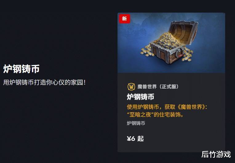 炉钢铸币是《魔兽世界》中的一种全新游戏内货币,专门用于住宅装饰的购买,玩家可使用战网余额以现金购买炉钢铸币。国服目前的价格为6元兑换100铸币。