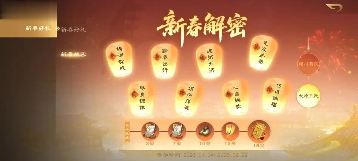 不仅如此,“新春盛典”期间,《三国杀OL》还推出了签到领史诗武将【界于禁】;参与新春解密,通过闯关获得夺宝券、祈福灯等好礼,并解锁颍川荀氏与太原王氏的精彩故事。此外,“国战”、“排位”等模式还有豪将限免等活动,可谓惊喜不断。